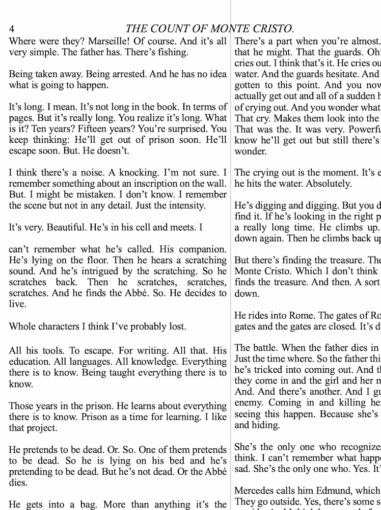 *In his lecture notes, Roland Barthes imagined of a new form of literary criticism; rather than theme or structure, pathetic criticism would reconstruct a novel’s most powerful, affecting moments. The novel Barthes had in mind was Alexandre Dumas’s The Count of Monte Cristo (1844-46), translator unknown. In 2011, I invited readers of all ages to talk to me about their most intense memories of the novel. The result was single page publication titled Exercise in Pathetic Criticism published by information as material in 2011.
